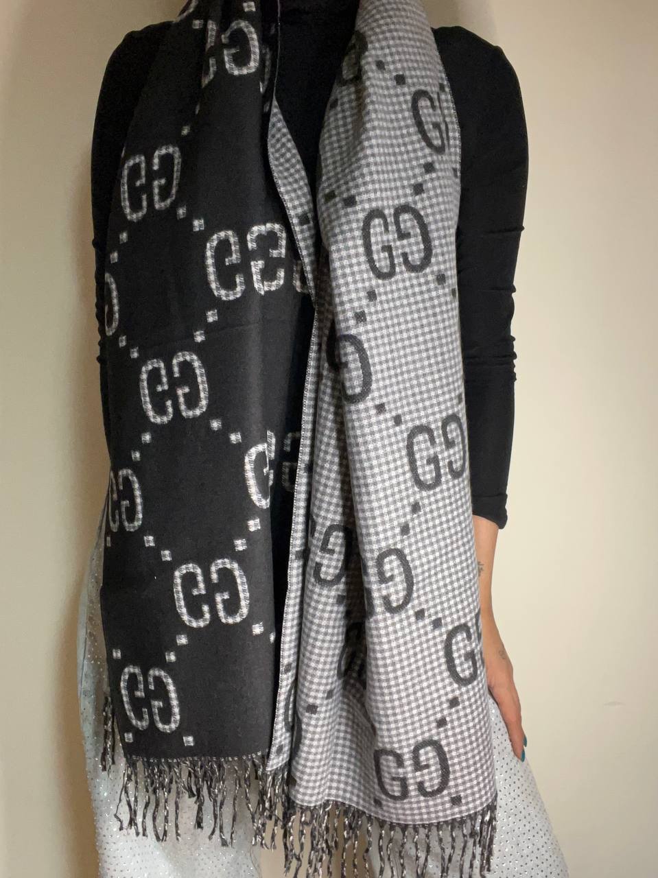 طراحی آن با بافت ژاکارد موتیف GG (لوگوی دو «G») انجام شده است، که یکی از معروفترین و شناختهشدهترین نمادهای گوچی است. لبههای شال به صورت فرنجد (حاشیه پرزدار) هستند که علاوه بر زیبایی، جنبهای از حرکت و جریان در بافت به آن میدهد.