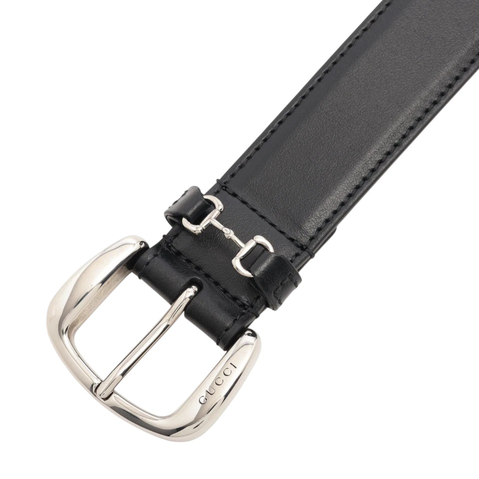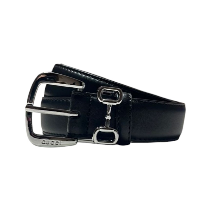 کمربند زنانه گوچی با چرم مشکی و سگک نقرهای حکاکیشده Gucci، دارای جزئیات طراحی Horsebit برای استایلی لوکس و کلاسیک.