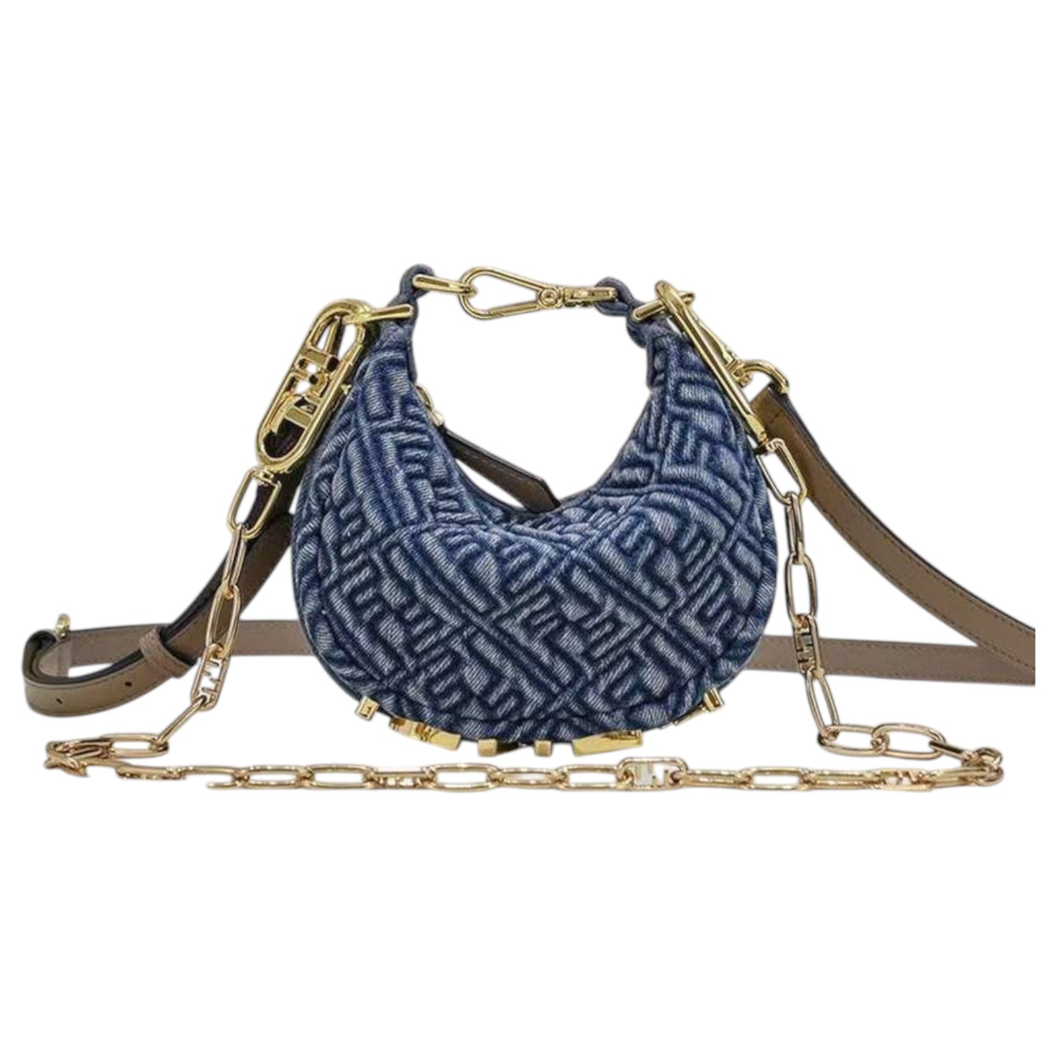 کیف زنانه Fendi Mini Hobo با طراحی لوکس، جنس جین طرحدار و یراقآلات طلایی، مناسب استایل روزمره و مجلسی.